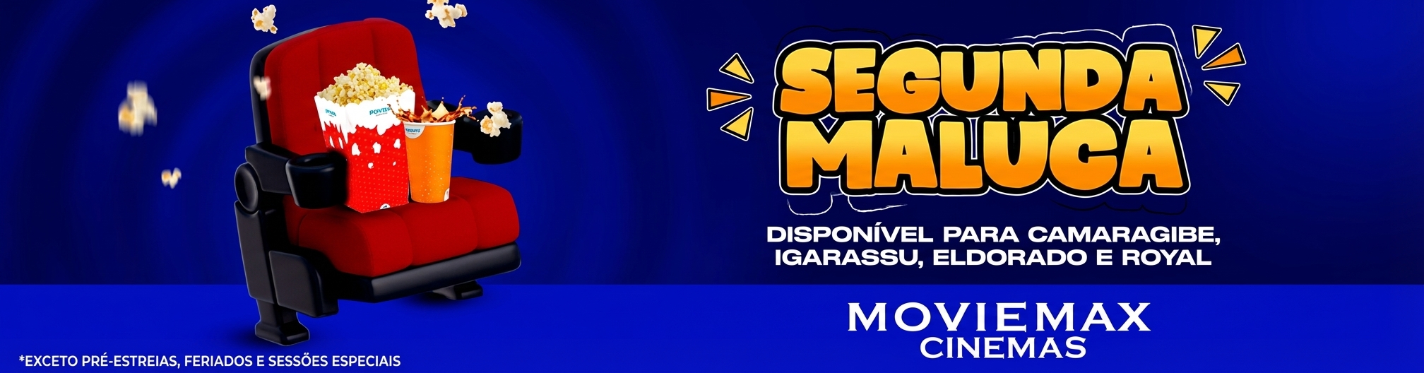 O benefício é aplicado em todas as sessões exibidas nos cinemas de CamaragibeRoyalEldorado e Igarassu, conforme a programação vigente.